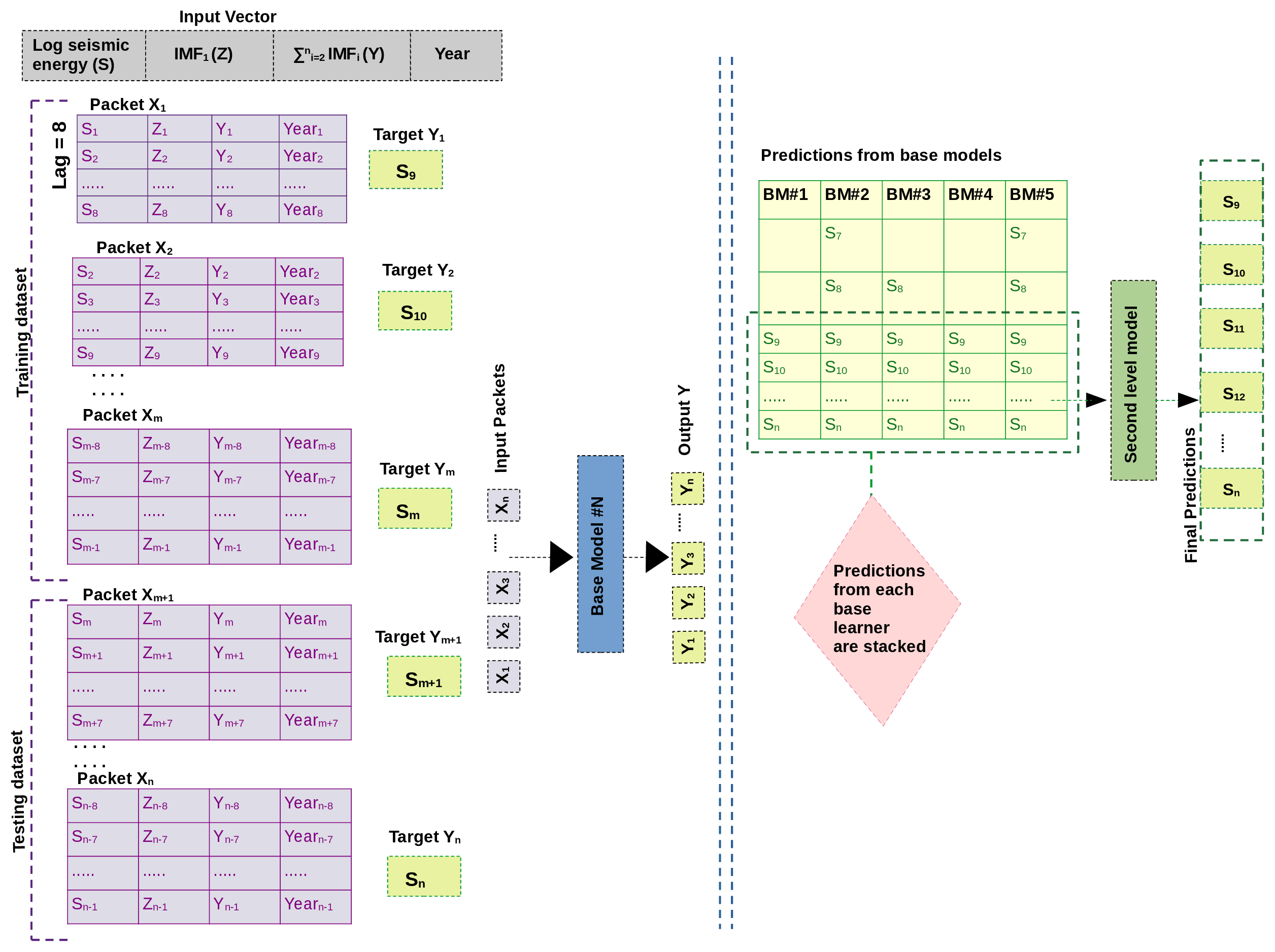 Apart from the individual machine learning techniques, ensemble learning is a mature and widely adopted methodology in the ML literature, renowned for averaging several models to enhance prediction accuracy and generality (Dietterich, 2000; De Gooijer and Hyndman, 2006; Alpaydin, 2007). Ensemble models combine different base learners based on techniques such as bagging, boosting, and stacking and thus maximize the variance in data, reduce overfitting, and improve model reliability. They have been successful across a variety of applications, including medical diagnosis and climate modelling to financial forecasting (Re and Valentini, 2012; Tan et al., 2022; Rezaei et al., 2022). Although extensively used, their use in seismic energy forecasting is still not well exploited, making the current research a timely and new addition in the geophysical hazard field.