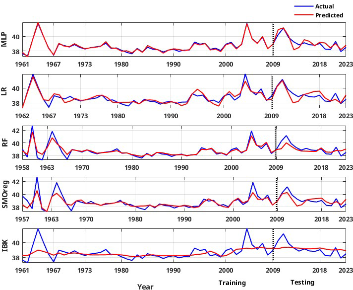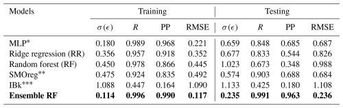 The representation of the model results and the comparison with the data are illustrated in Fig. 18 for the individual model and Fig. 19 for the ensemble model. Similar to that observed for the global data, we observed varied performance in the training and testing phases. Furthermore, the qualitative performance seemed to improve by adopting the ensemble model. Standard statistical metrics such as the Pearson correlation coefficient (R), performance parameter (PP), root mean squared error (RMSE), and standard deviation of error (σ(ϵ)) were employed to objectively assess model performance. Table 5 displays these values for the Western Himalayan model. In an ideal case, the values of R and PP should be unity, and the value of σ(ϵ) should be 0. With an R value of 0.989 and 0.848, respectively, and a PP value of 0.968 in training and 0.685 in testing, Table 5 clearly shows that the multi-layer perceptron (MLP) outperformed the other models. The same is true for an R value of 0.989 in training and 0.848 in testing. The same is evident from Fig. 14, where for both the training and testing phases, the MLP model is observed to capture the data variations better than other architectures. Furthermore, when the prediction made from the individual techniques is employed as input for the ensemble random forest model, its performance increases significantly, with RMSE values of 0.117 and 0.236 in the training and testing phases, respectively. These findings show the satisfactory performance of the model, ensuring a reliable prediction. This improvement is also evident from the ensemble RF model presented in Fig. 15, where the model is able to capture the peaks and troughs efficiently.
