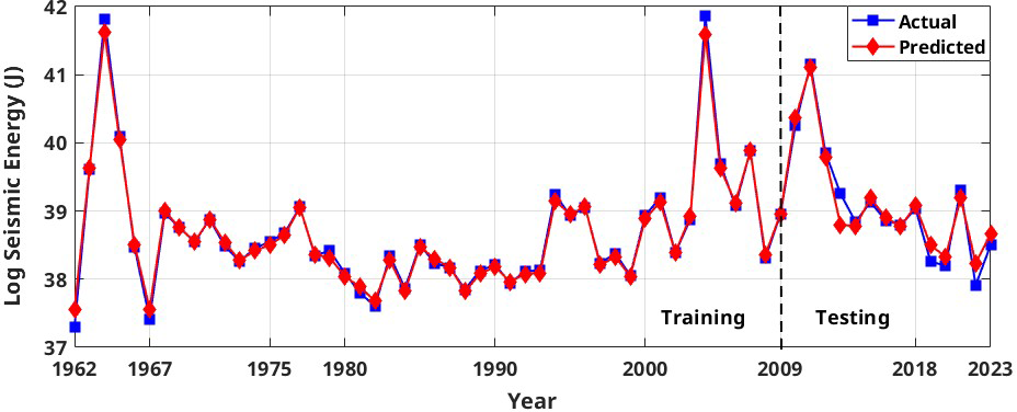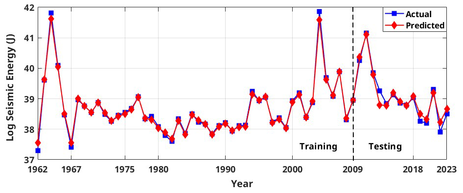 Figure 10Actual vs. predicted values for global seismic energy from the proposed ensemble random forest model for the validation catalogue.