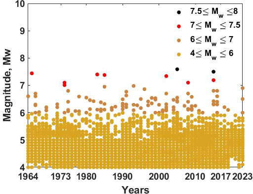 From the tectonics described earlier, the Hindu Kush region and the adjoined region are seismically very active, as evident from Fig. 12. This observation is consistent with both the frequency of documented earthquakes and the geographical distribution of faults and lineaments (Fig. 12). This has motivated researchers to divide the whole geographical area of the country and the adjoining region into different seismic zones. For instance, Khattri et al. (1984) used seismotectonic and seismicity data to split the nation into 24 source zones. Bhatia et al. (1999) found 85 source zones in India, whereas 40 seismic zones were detected by another research Parvez et al. (2003). Considering all these past efforts, the National Disaster Management Authority (NDMA) of India created a thorough study in 2010 that further divided the whole Indian subcontinent into 32 seismic zones, designated SZ-1 to SZ-32 NDMA (2010). This division of seismic zones was done by considering factors such as regional geodynamics, fault alignment, and recurrence parameters for the regions. Among these 32 zones, the present study focuses on earthquakes in SZ-1, SZ-2, SZ-6, and SZ-30, which lie in the western part of the Himalayan belt. As this is preliminary work towards energy prediction for the regions, the comprehensive catalogue is combined together for all zones in the Western Himalayas. Here, the earthquake catalogue for the region has been taken from Dhanya et al. (2022) and was updated until 31 December 2023 via the USGS seismic database (https://earthquake.usgs.gov/earthquakes/search/, last access: 20 November 2024). There are 25 769 events (for the Western Himalayan region considered for this work) in the final updated catalogue, spanning from 1250 BCE to 2023 CE. Furthermore, the updated catalogue has been checked for both completeness for year and magnitude. For completeness of year, the method suggested by Stepp (1972) has been adopted, in which the standard deviation of the mean rate is plotted as a function of the sample length, and the period where this value deviated from the tangent, i.e. , is considered as completeness for the considered magnitude. Furthermore, the magnitude of completeness is identified from the maximum curvature method proposed by Wiemer and Wyss (2000). The catalogue compiled for the region in the present work is observed to have a magnitude of completeness of Mw 4 and a corresponding year of completeness of 1964 (Fig. 13a and b). Hence, events spanning from 1964 and having a magnitude greater than Mw 4 have been considered for further input preparation. The distribution of the event in the final compiled catalogue can be identified from Fig. 14.