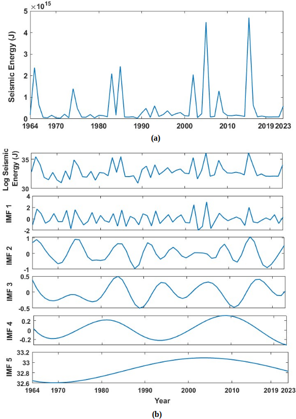 Figure 15(a) Annual seismic energy estimated for the catalogue compiled for the Western Himalayas. (b) Log-scaled seismic energy for the Western Himalayas, and the corresponding intrinsic mode function obtained by employing ensemble empirical mode decomposition (EEMD).