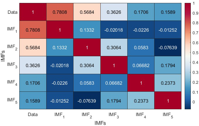 Figure 4Correlation of the intrinsic mode functions obtained from the global seismic energy time series of global catalog.