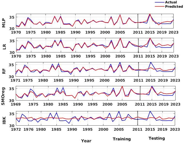 To ensure optimal performance of the models, we employed grid search techniques for hyperparameter tuning. Grid search is an exhaustive search method that tests all possible combinations of specified hyperparameters to identify the best-performing configuration for each model. The process involves defining a parameter grid for each model, specifying a range of values for each hyperparameter. For example, for the multi-layer perceptron (MLP), the grid includes different numbers of neurons in the hidden layers, learning rates, and momentum values. For the random forest (RF), the grid includes the number of trees and maximum depth. Each combination of hyperparameters is evaluated using an 80:20 train–test split method. The dataset is divided into 80 % training and 20 % testing sets, with the model trained on the training set and evaluated on the testing set. The performance of each hyperparameter combination is assessed using an appropriate evaluation metric, such as the mean squared error (MSE) or root mean squared error (RMSE). The combination of hyperparameters that results in the lowest error (or highest accuracy) on the training set is selected as the optimal configuration for the model. The final model, with optimized hyperparameters, is then tested on the testing dataset to evaluate its generalization performance. This ensures that the selected model configuration not only performs well on the training data but also maintains its accuracy, generalization, and robustness.