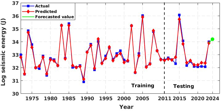 Additionally, we made an effort to predict the anticipated yearly seismic energy release for 2024. According to the ensemble model that was built, the estimated seismic energy falls between 5.69 × 1014 and 9.11 × 1014 J. This range highlights the region's potential for a destructive event and corresponds to a maximum predicted magnitude of roughly Mw 7.17. Even with these encouraging outcomes, the performance of the existing model might be enhanced by adding more geophysical variables, increasing the catalogue inputs' geographic resolution, and adding real-time updates for operational forecasts. These are potential directions for future growth.