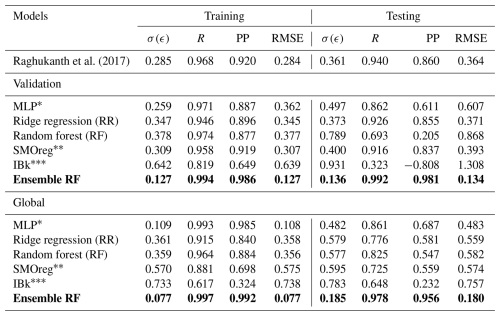 Based on the optimized hyperparameters, the predictions from the models trained on the data derived from the validation and global catalogues in the training and testing phases are summarized in Figs. 8 and 9 for the individual models. The performance is observed to vary between models in both the training and testing parts. Hence, to have a quantitative evaluation of the model performances, the following indicators are estimated for both the training and testing phases: