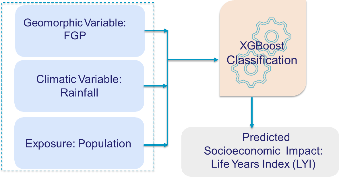 Figure 2Conceptual framework. Considered predictors are flood geomorphic potential (FGP), rainfall, and population. The predicted value is the socioeconomic impact, characterized as the life year index (LYI) (Noy, 2016a, 2015). Readers should refer to the main text for an explanation of the predictors and predicted values.