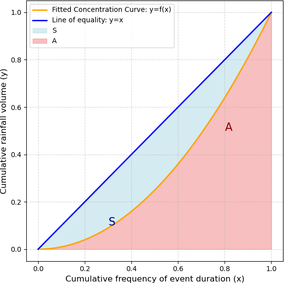 We identified storm events from this dataset primarily based on the criterion of rainfall of more than 0.5 mm, and we separated events when rainfall was below this threshold for more than 12 h. Furthermore, we calculated CI using the cumulative amount of rainfall and the cumulative frequency of the event duration (Fig. 5) for the selected events. The method (similar to the methods of Cortesi et al., 2012, and Monjo and Martin-Vide, 2016) eventually aggregates the amount of precipitation that falls during each event into increasing categories and determines the relative contribution (as a percentage) of the progressively accumulated precipitation as a function of the accumulated percentage of the durations of the events. The concentration index is then calculated as the ratio of the area between the line of equality (y=x) and the fitted curve (S) to the total area under the line of equality (A+S) (Fig. 5, Eq. 2). The index is defined by the relationship between the accumulated percentage of time and the accumulated rainfall.