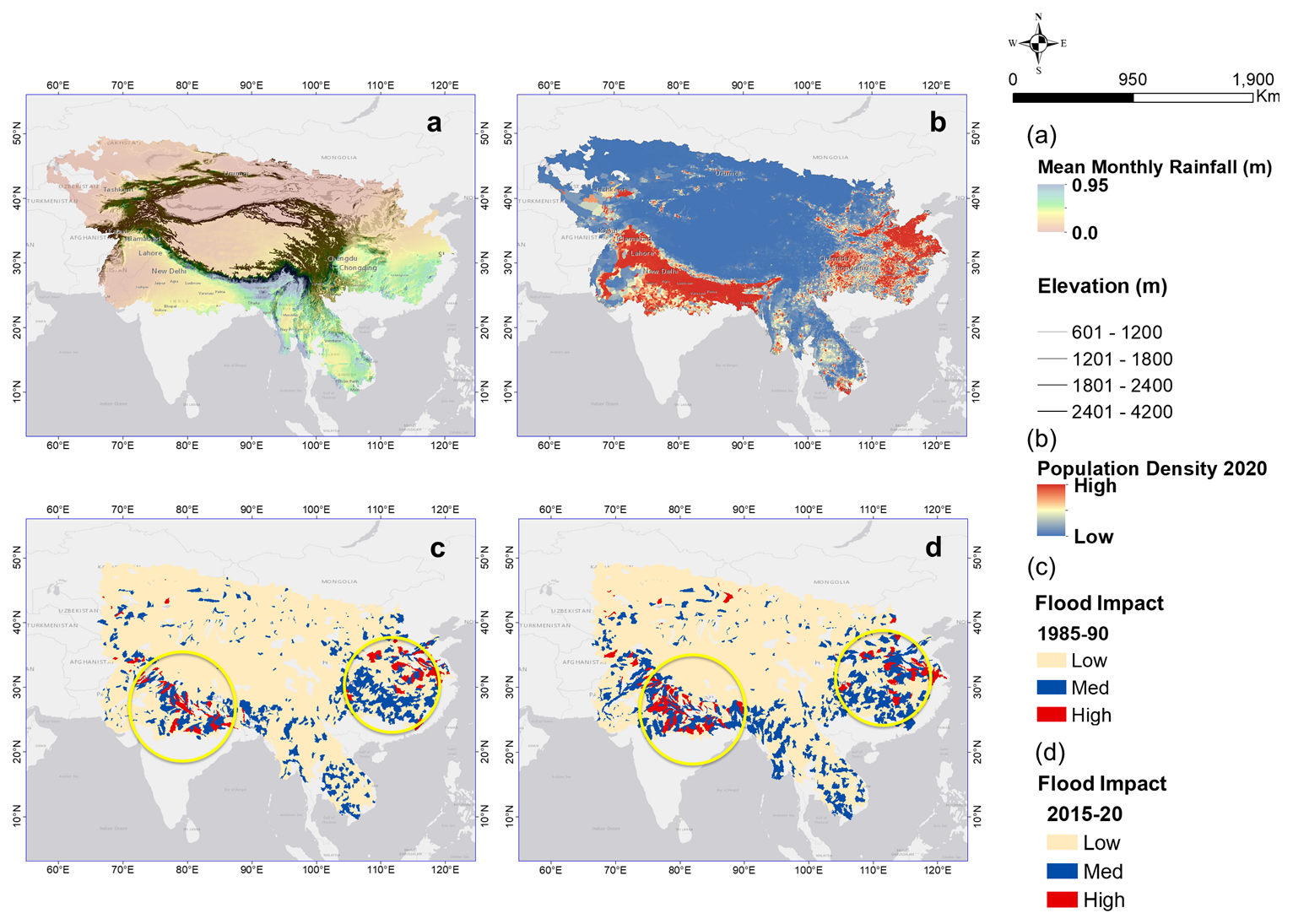 Figure 10(a) Mean monthly rainfall overlaid on elevation (contours); (b) population density 2020; (c, d) example of predicted basin-averaged flood impact for HMA (c, 1985–1990; d, 2015–2020). Yellow circles denote the changes in flood impact between the two timelines (background image sources: Esri, DeLorme, HERE, MapmyIndia).