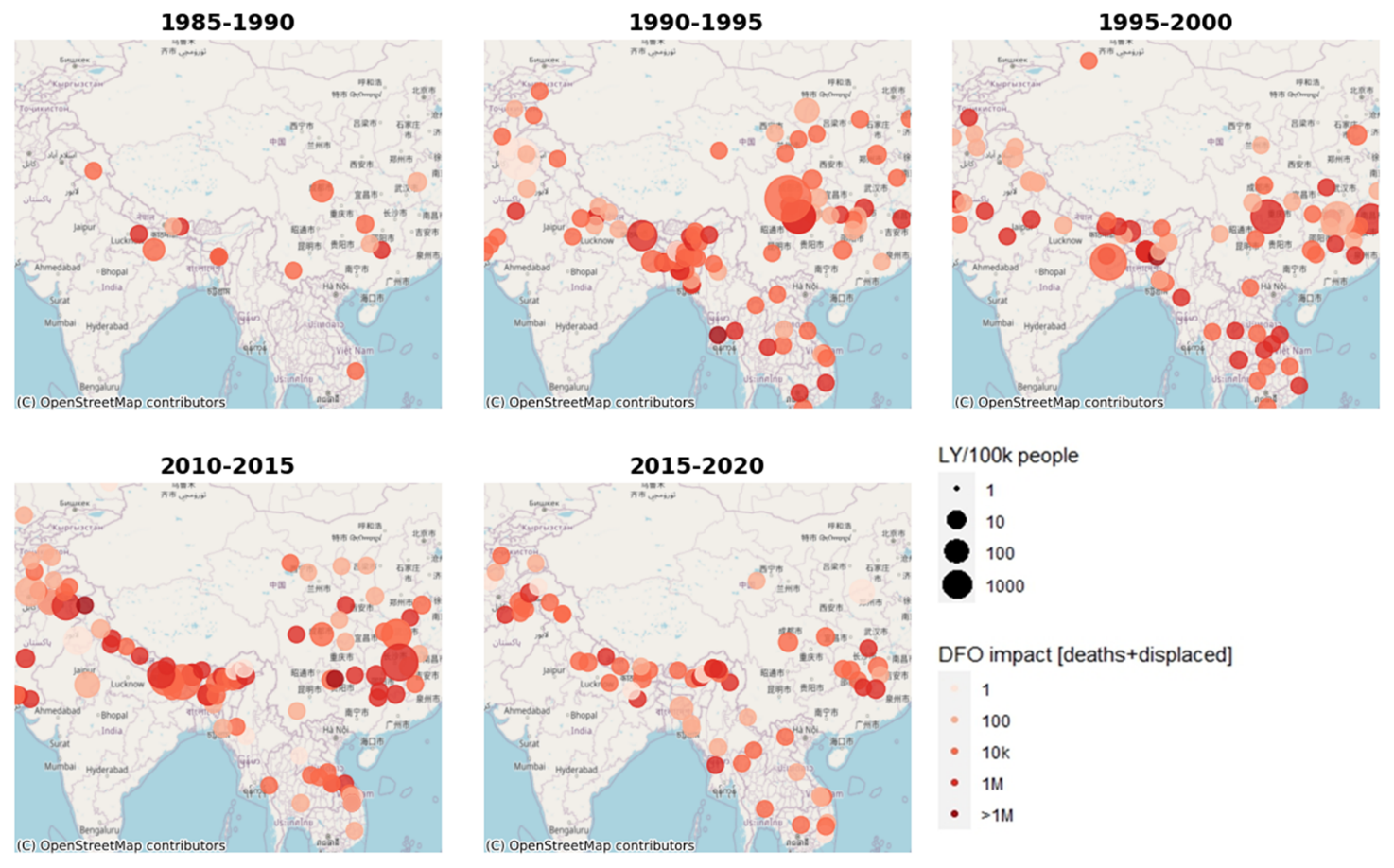 Figure 11 shows the LYI per 100 000 people (LYI per 100 000) evaluated for different time frames for all the locations reported in the DFO database to compare the DFO severity with our predictions. Overall, the DFO and predicted results were quite consistent with some minor variability in some scattered areas. When we compared the changes over time, we noticed an increase in vulnerability. As the plot makes evident, the largest changes took place in 1990–1995 and 2010–2015; the two concentrated areas were Nepal and China. As Fig. 3 shows, two big jumps occurred during these timelines for Nepal because of extreme storm-induced flood events. In Fig. 3, we show the predominant events that occurred in these timelines. Regarding China, as of June 2010, more than 29 million people had been affected by flooding, with up to 2.37 million evacuated and 195 000 homes destroyed (International Federation of Red Cross and Red Crescent Societies, 2010).