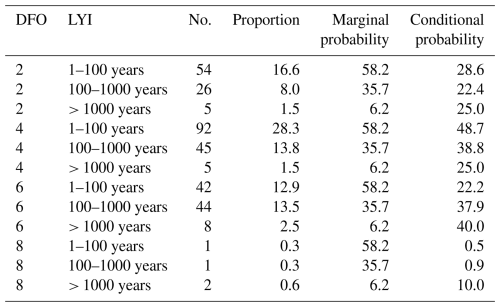 Summarizing the results presented in Table 3, we can say that, for the years shown, we predicted almost 57 % of watersheds (marginal) having LYIs between 1 and 100 years (low), 35.9 % having LYIs between 100 and 1000 years (medium), and only 6 % having LYIs greater than 1000 years (high). For the entire period, most of the time we predicted LYIs of 1 to 100 years, for which we captured events of DFO severity of around 2 (102 deaths + displaced) (conditional = 28.6 %). This suggests that most “low”-class DFO events did happen in the watersheds within the lowest predicted LYI range. Readers must consider that “low” in this case means the flood impact can range from 1 to 100 years lost, and a DFO value of 2 means total deaths and displaced are on the order of 102 people. The events with a DFO value of 4 happened mostly in watersheds with predicted LYIs ranging between 1 and 100 years and between 100 and 1000 years. The events with DFO values of 6 and 8 happened mostly in ranges greater than 1000 years and between 100 and 1000 years.