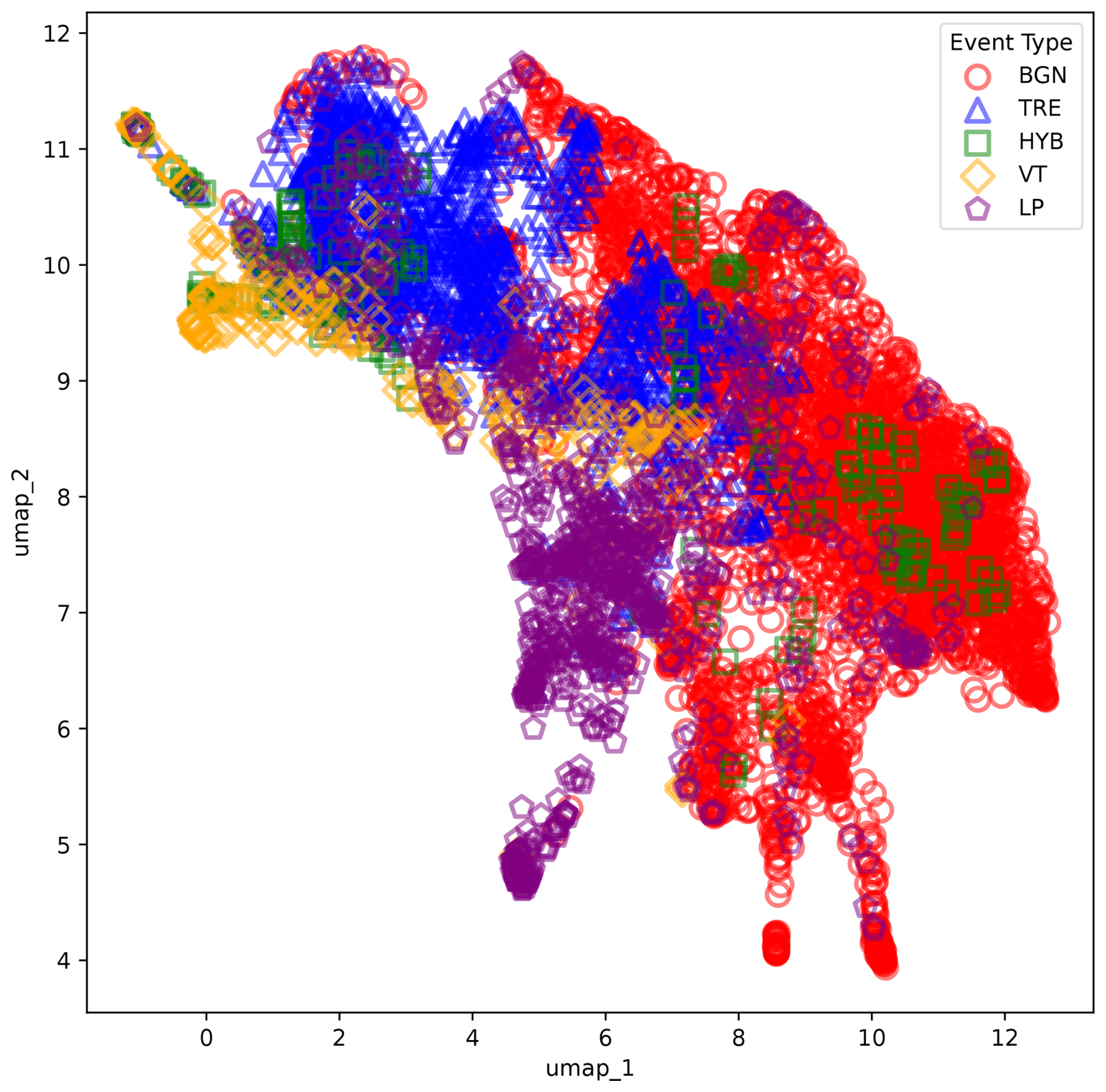 Figure 2Uniform Manifold Approximation and Projection (UMAP) representation obtained for the input vector forming the original data of the MASTER-DEC dataset. Different seismic categories (e.g., BGN-TRE or VTE-LPE) may have elements located in overlapping areas of the representation space, where they share similar projected features.