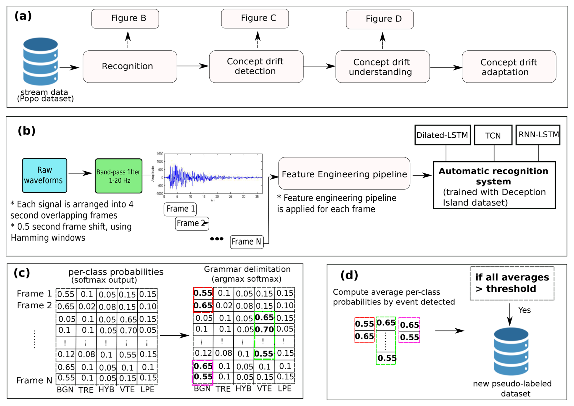 Figure 3(a) Overview of the weakly supervised event selection algorithm developed. A subset of the dataset (in our case 40 % of the total) is used as a training set by the reference pre-trained systems. The rest of the data are used as a test set. Only high per-class probability recognized events are selected as new training instances. (b) Workflow structure and the specific pre-processing steps employed, which rely on frequency analysis within the log frequency filter bank domain (Titos et al.2022). (c) For each detected event, the confidence of the detection is analyzed using a probabilistic event detection matrix with per-class probabilities output by the systems. (d) Drift adaptation mechanism based on an adaptive threshold is then adopted. Those events whose average per-class probability is greater than a given threshold are selected and included as new training instances.