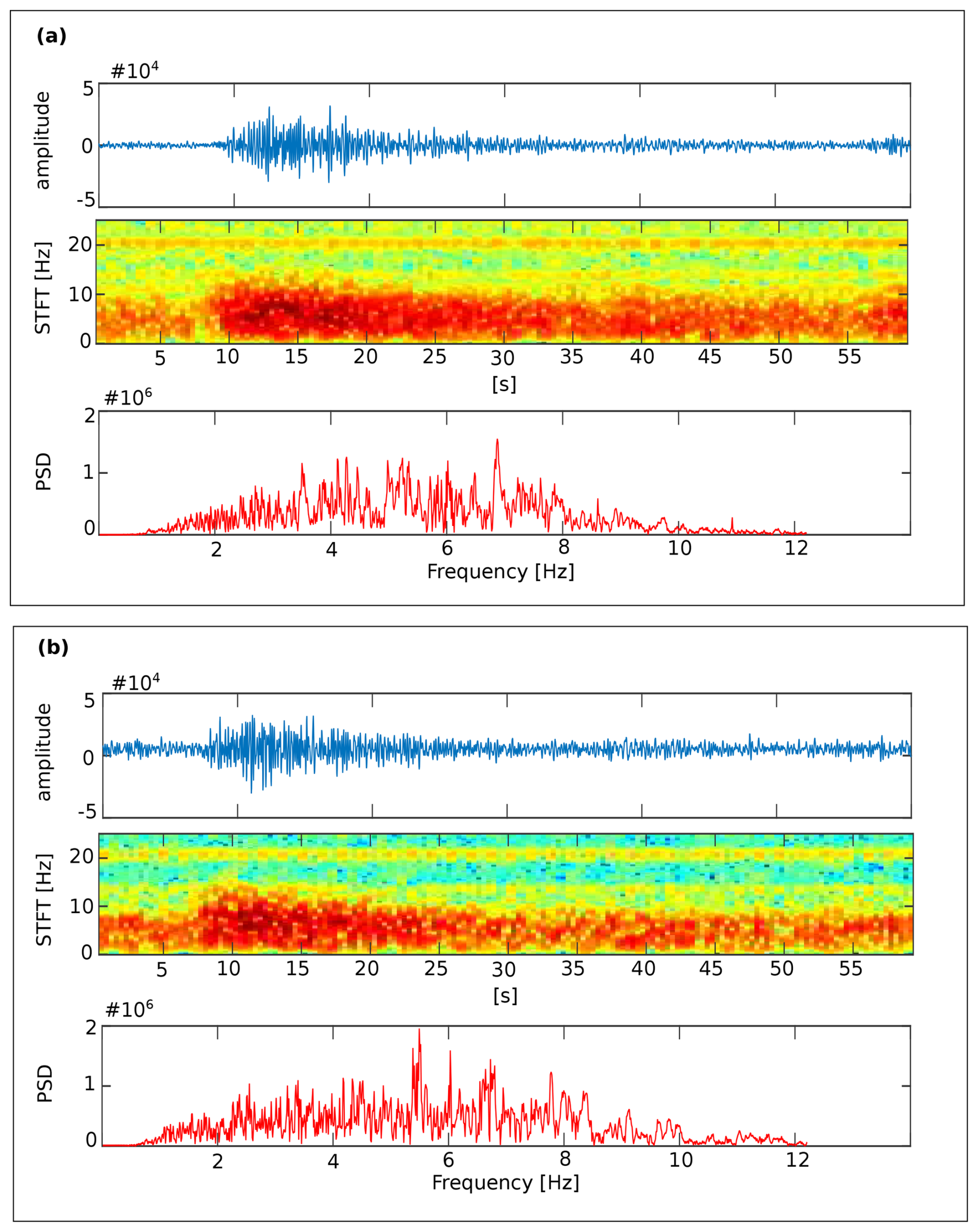 Regarding the detection of events identified by the systems but not annotated in the catalog, on average, RNN-LSTM and Dilated-LSTM detected approximately 60 earthquake-type events, while TCN identified over 150. Figure 11 presents a couple of examples of such earthquakes. The PSDs reveal that they share characteristics consistent with those of earthquakes. However, as indicated by the probabilities shown at the top of the figure, their partial similarity in spectral content prevented them from being classified with higher confidence.