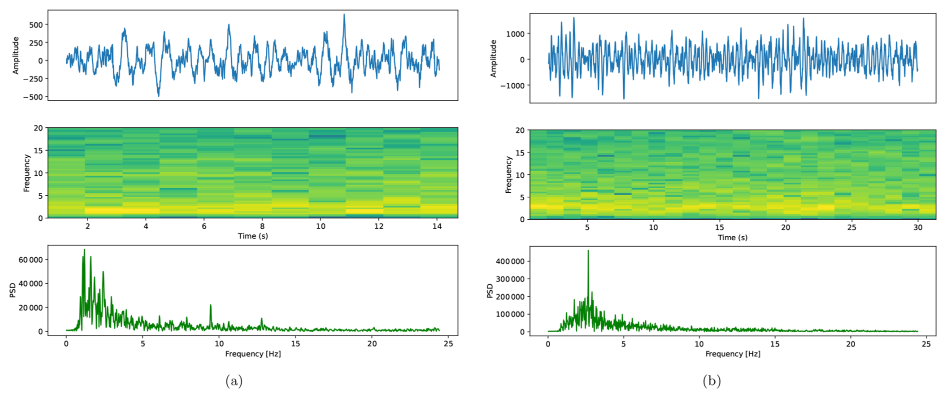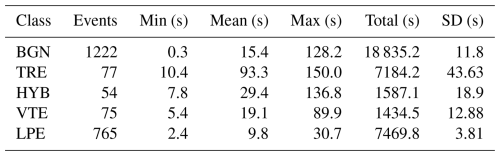 Table 3POPO2002 dataset. The table reflects statistics on the duration of the signals and the number of events for each class. Seismic categories: explosion (EXP), garbage (GAR), hybrid event (HYB), long period event (LPE), volcano-tectonic earthquake (VTE), background seismic noise (BGN), and volcanic tremor (TRE). Duration is in seconds (s).