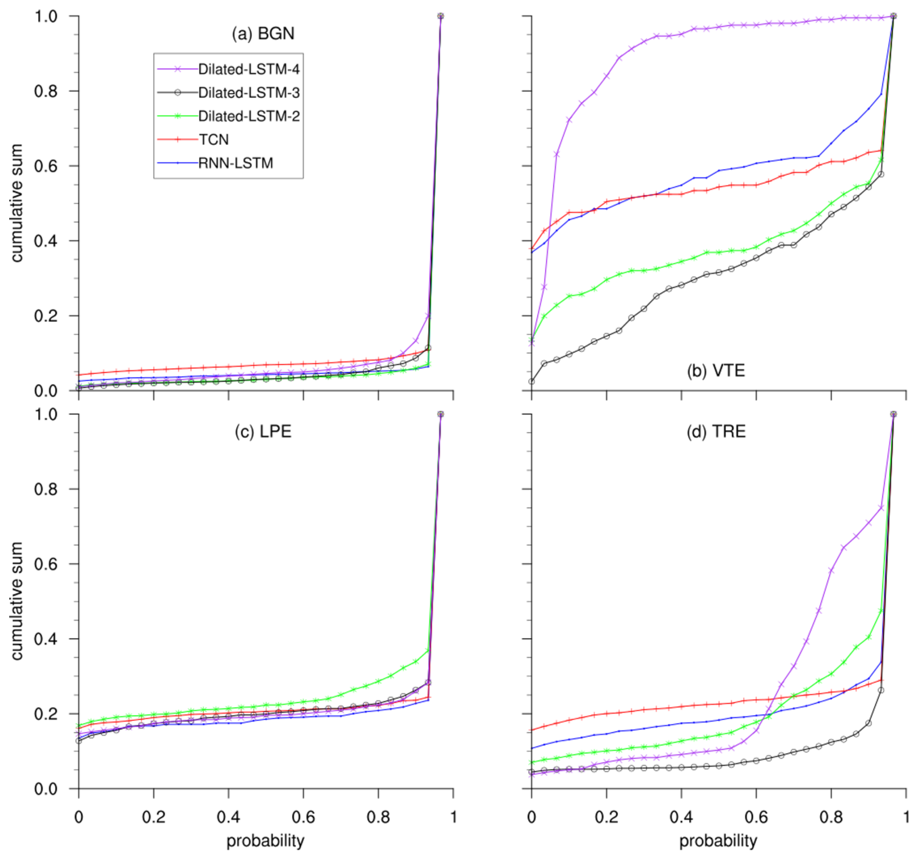 Figure A1Recognition confidence analysis on the MASTER-DEC dataset. CDFs of the recognition probabilities for each event in the master database are shown. Dilated-LSTM-2, Dilated-LSTM-3, and Dilated-LSTM-4 refer to the Dilated-LSTM architectures with two, three, and four hidden layers, respectively, for the sake of comparison.
