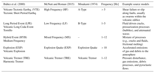 In volcanic seismology, the presence of various seismic signals – such as volcano-tectonic earthquake (VTE), long-period event (LPE), ultra-long-period (ULP) event, hybrid (HYB) event, explosion (EXP), and volcanic tremor (TR) – indicates the existence of multiple seismic sources, which can sometimes operate simultaneously and must be considered. Thus, models of brittle rock fracturing, conduit resonance, pressure transients in fluids, bubbles, cracking in viscoelastic media, elastic energy transfer by fluid flow, debris flows, and many others are used (Ibáñez et al.2000; McNutt and Roman2015; Minakami1974). Table 1 summarizes the source models and the classification of events for different authors. The complexity of seismic sources leads to varying interpretations of volcanic dynamics, influenced by the predominant signal type and its spatio-temporal evolution. Comprehending the underlying physics of eruptions, and therefore why they occur, cannot be fully explained through signal processing alone. It requires knowledge of the frequency of occurrence and the types of seismic events that occur. This understanding is primarily achieved through the construction of seismic catalogs, which are then analyzed to infer volcanic dynamics during future crises. However, building complete catalogs presents significant challenges due to factors such as noisy signals, human error, intense seismic activity, and overlapping signals, all of which complicate the identification and classification of seismic events.