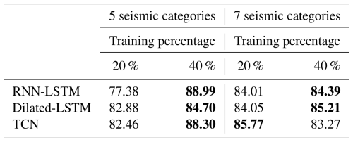 Table 4Self-consistency results using five and seven seismic categories, with 20 % and 40 % of the data for training and 80 % and 60 % for testing, respectively. The results correspond to the average accuracy over the four partitions. The values in bold indicate the best result for each model for each experiment.