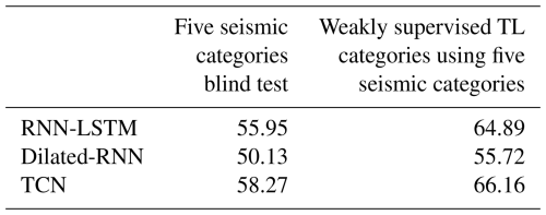 Table 6Classification accuracy (acc. %) on the test set achieved by the pre-trained systems, which were retrained using the proposed weakly supervised approach with the training partition set to 40 % of the total POPO2002 dataset and only five seismic categories.
