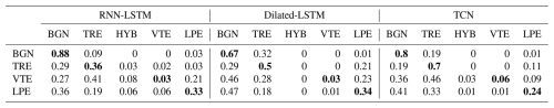 Table A3Precision, recall, and F1 score for the TCN architecture.