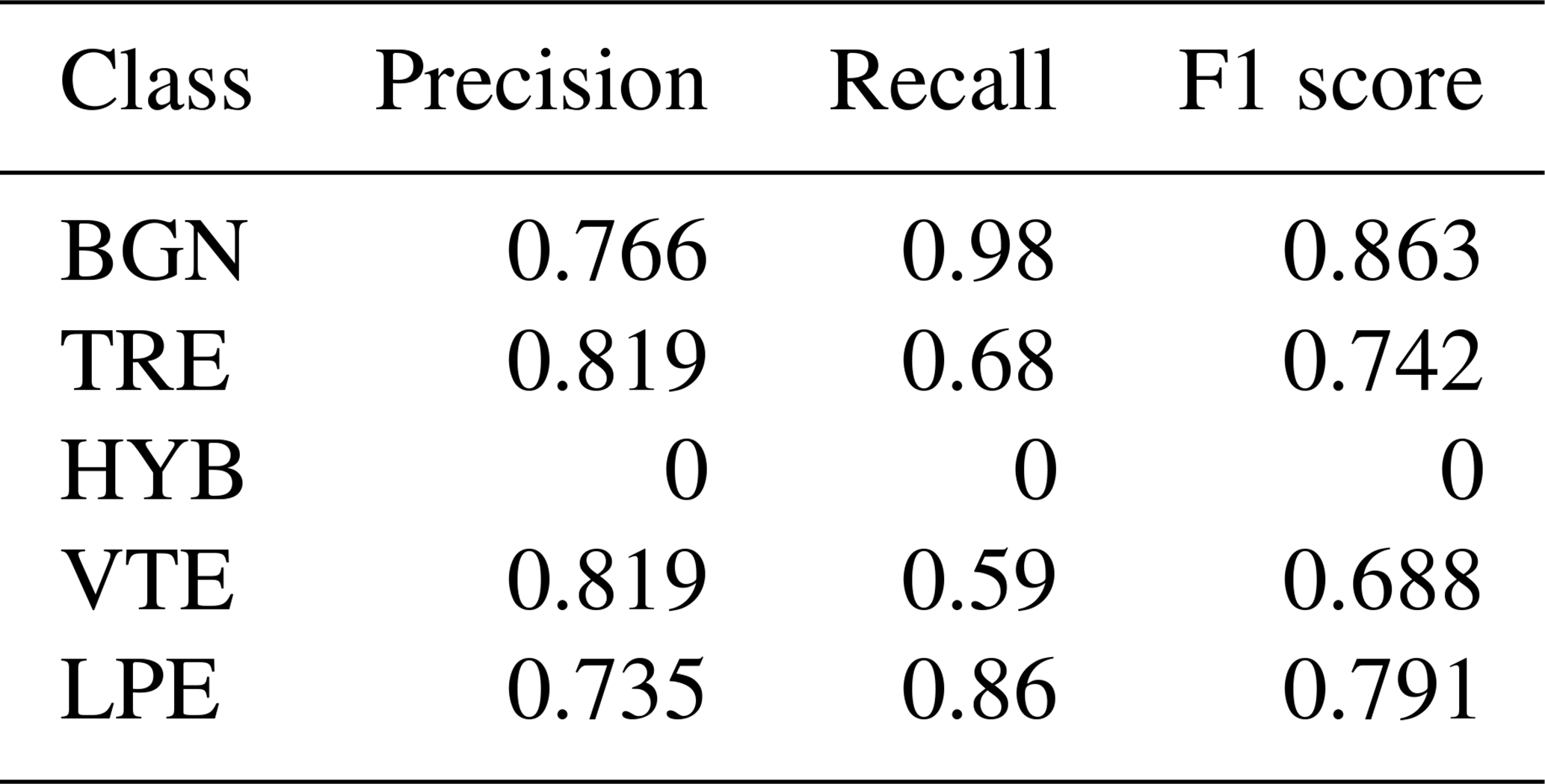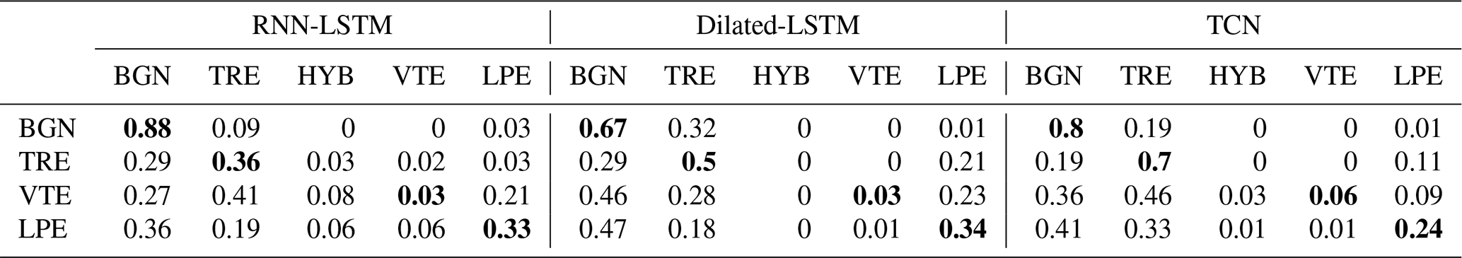 Table A2Precision, recall, and F1 score for the Dilated-LSTM architecture.