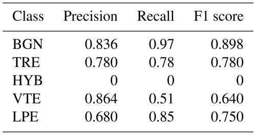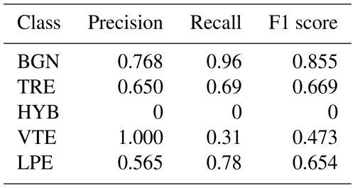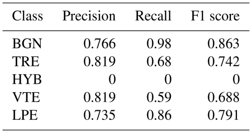 Table 5 in the paper refers to the best results obtained in Table 4, which were achieved using a training split of 40 % of the total data and considering five seismic classes. This section presents the results primarily in terms of the F1 score. This metric provides an evaluation of the model's performance by considering both precision and recall, thereby strengthening the interpretation and discussion of the results.