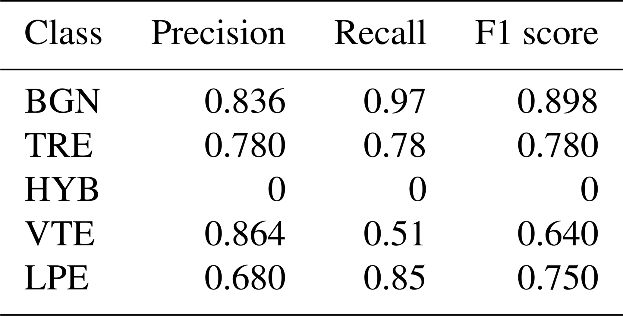 Table A1Precision, recall, and F1 score for the RNN-LSTM architecture.