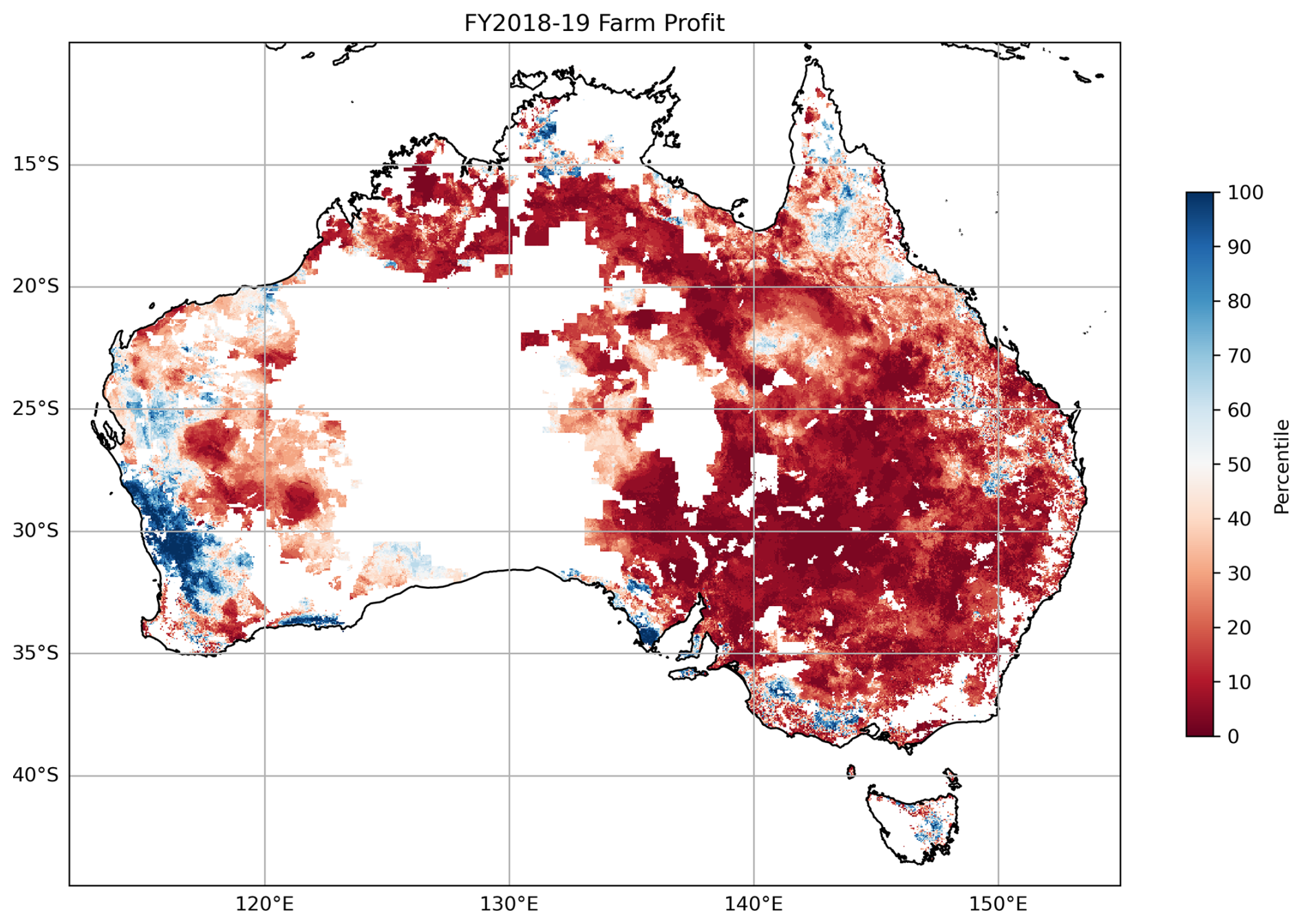 The Australian Bureau of Agricultural and Resource Economics and Sciences (ABARES) has developed a statistical farm microsimulation model – farmpredict – which integrates climate data and farm survey data to predict consolidated farm profit for a region (Hughes et al., 2019, 2022b). An example of farmpredict output is provided in Fig. 1, which shows the expected relative farm profit for the financial year 2018–2019, where the negative impact of the Tinderbox Drought (Devanand et al., 2024) on farm profits can be seen over south-eastern Australia. The question arises, then, whether farmpredict can be successfully driven by climate forecast ensembles to generate skilful forecasts of financial outcomes for farm businesses.