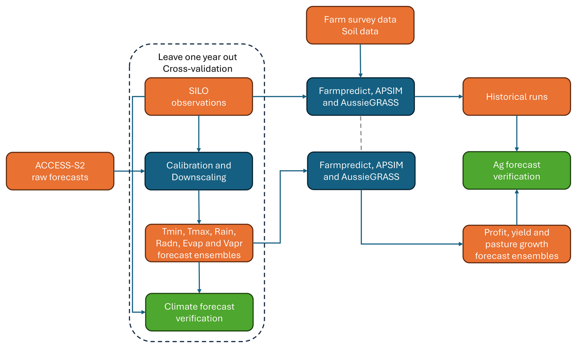 Figure 2Schematic of the workflows for (1) generating and verifying climate forecasts under leave-1-year-out cross-validation and (2) subsequently generating and verifying profit, yield and pasture growth forecasts.