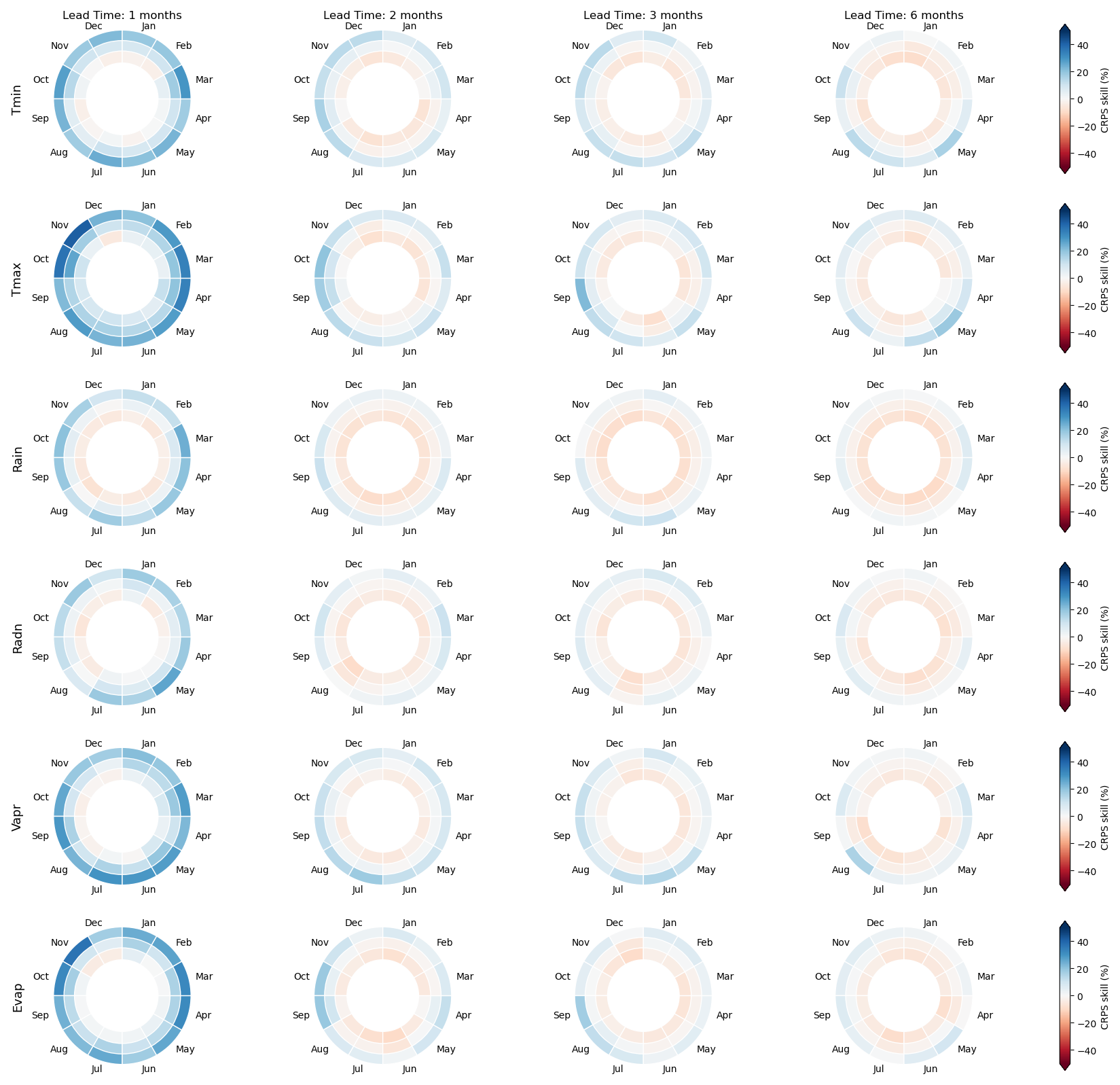 Figure 3Summary of CRPS skill scores of the climate forecasts over the climate hindcast period 1981–2018. The three rings depict the median (middle ring) and interdecile range (inner ring = 10th percentile; outer ring = 90th percentile). Each ring segment represents a forecast issue month from January to December in a clockwise direction. Target climate variables are in rows, and the lead times (months ahead) are in columns.