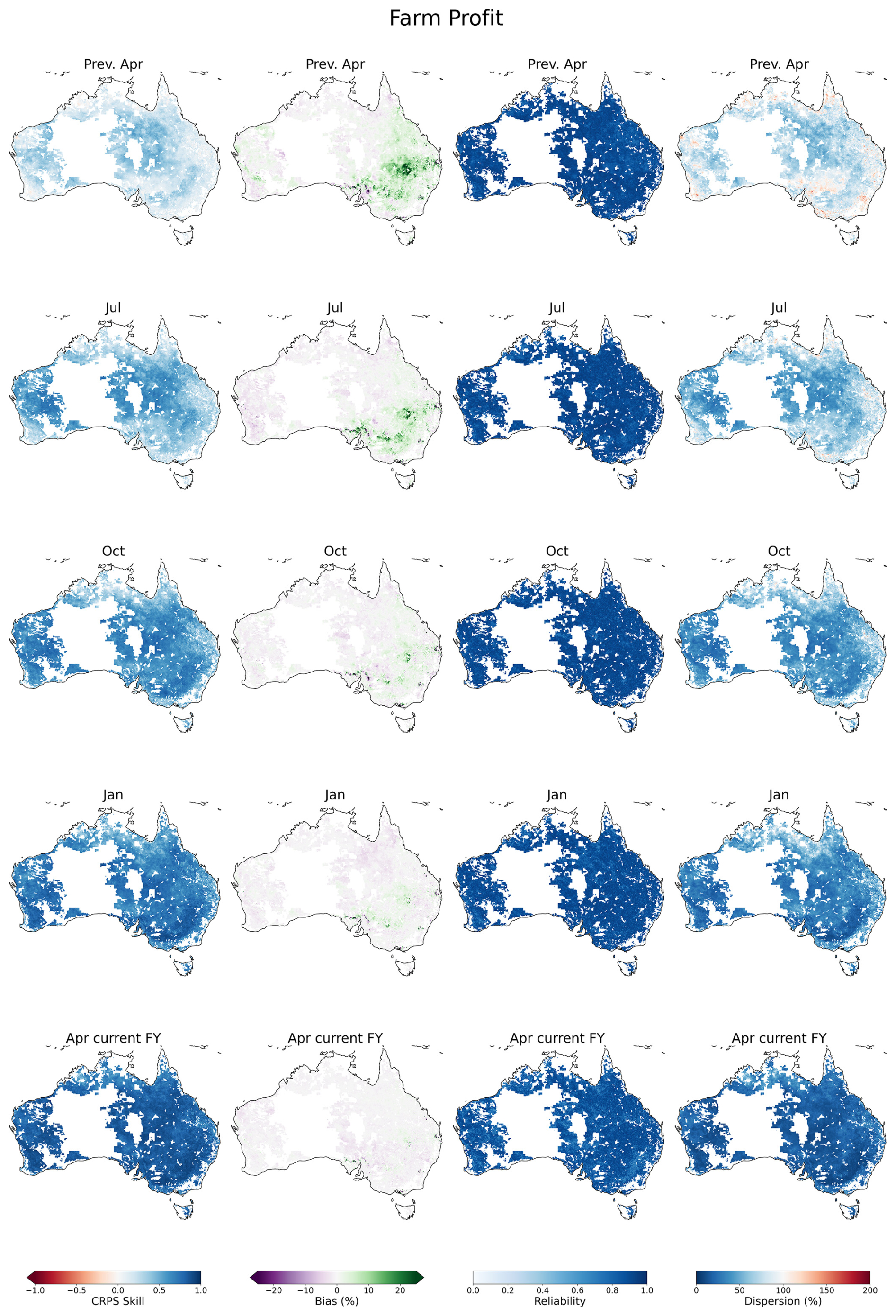 For each forecast issue month, the skill of farm profit predictions shows limited spatial variation, suggesting that forecast errors are relatively consistent across different climatic and agricultural zones. Reliability is high (> 0.8) for all forecast issue months and regions. High reliability indicates that the forecast probabilities are consistent with the frequency of outcomes, and, therefore, the ensemble spread is typically unbiased and of appropriate spread. The relative width of the forecasts is also measured through dispersion, showing that, compared to the historical distribution of profits, the forecast ensemble spreads tend to be about as wide as the historical distribution at long lead times. As forecast skill improves, the spreads narrow in concert with the increase in skill, suggesting that the economic forecasts remain well calibrated. Moreover, in cropping regions, dispersion is lower in January and April compared to (say) northern regions, with a differentiation between completed crops and pasture-dominant areas, consistent with farm profits in the winter cropping zone being highly dependent on April-to-October rainfall.