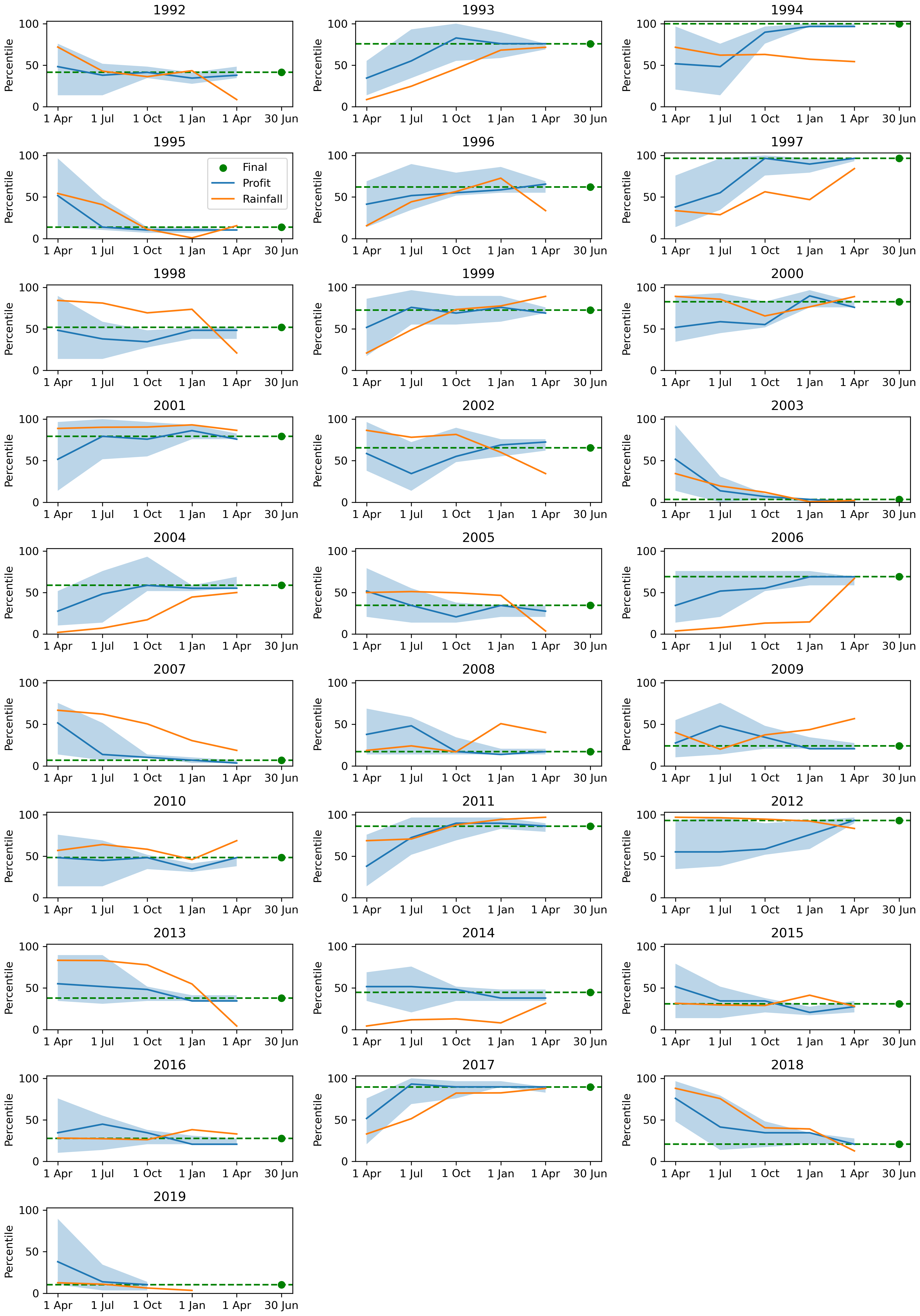 To analyse how the retrospective forecasts evolve over time at a national scale, the percentiles of spatially averaged farm profit are plotted against the forecast issue month for each hindcast year, along with the final farm profit and, as a reference indicator, percentiles of 12-month observed rainfall deficits. All grid cells are weighted equally in the averaging. Although the rainfall deficit percentiles do not directly correspond to final farm profit, their evolution can offer insights into how such a lagging indicator, currently used for drought assessments, behaves in comparison with the forecast indicator.