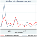 We use the median of observations when rain damage occurred to display the common trend assumption in the figure below, because the average is sensitive to outliers, and we compare only two small neighbourhoods. The intervention period is displayed in the figure as well. The time trends of median damages in both the control group and treatment group are similar before the interventions takes place and start to differ after the start of the intervention period. Therefore, the interventions seem to impact the trend of the median rain damage. After the interventions, the median rain damage rises in the control group, but decreases in the treatment group. Initially, the rain damage of the treatment group is higher than the damage of the control group. Over time, more measures have been implemented. After most of the interventions have finished, the damage of the treatment group decreases and becomes less compared to the control group.