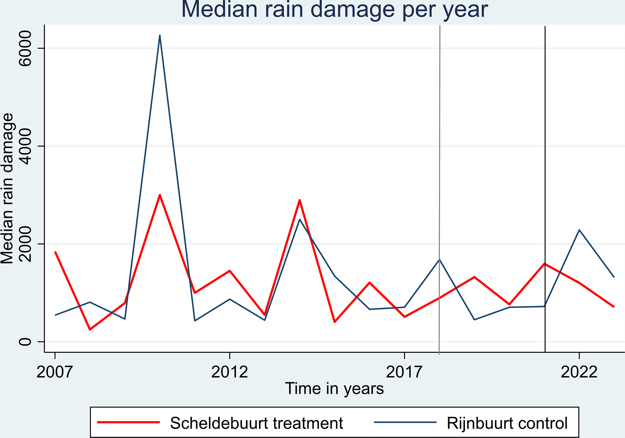 The central assumption for a DiD-analysis is the common trend assumption, which states that, in the absence of the treatment, the treatment and control groups would have followed a similar trend (in our case of insured damages) over time (Angrist and Pischke, 2009). This assumption allows for isolating the treatment effect from any other factors that may influence damage from rainfall. If both neighbourhoods were on different damage trajectories before the policy interventions, differences in their post-interventions outcomes could be attributed to these pre-treatment differences. Additionally, it is assumed that no significant changes in group composition occur over time. Data from Statistics Netherlands indicates that there were no shocks to the demographic composition of the neighbourhoods during the study period, supporting this assumption. Moreover, key demographics are controlled for in our regression model.