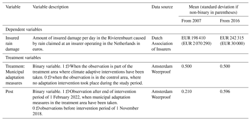 Control variables are added to check for neighborhood specific effects when establishing the relationship between the adaptation measures and the amount of damage. Two categories of variables are controlled for. Precipitation data is added on PC4 level over the period damage data is available from 1 January 2007 until the 15 March 2024. The nearest weather station of the Royal Netherlands Meteorological Institute (KNMI) is located at Schiphol airport, which is approximately 10 km from the Rivierenbuurt. Two types of data are derived from the weather station: data on amount of precipitation per day and data on maximum precipitation per hour. Both are included, because moderate rain over a long period within a day can cause damage as well as torrential rain in a short moment. The observations of the damage data are on the day on which the claim is filed. The claim can be filed on the same day as the event that caused the damage. However, people can also file claims one or two days later. Therefore, for both rain control variables we use 1 and 2 d lags.