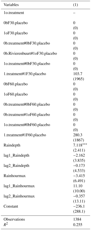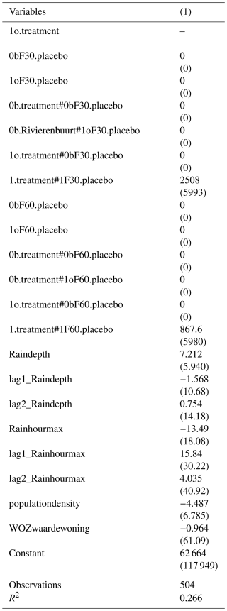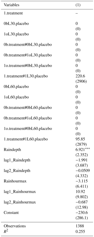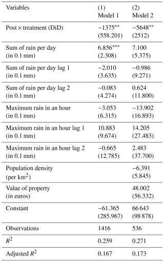 Table D1Two-way fixed effects DiD regression on insured damage per day in case of maximum rain per hour exceeds 2 mm h−1 with observations in the intervention period.