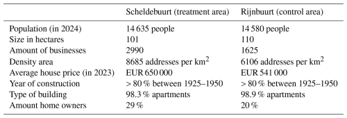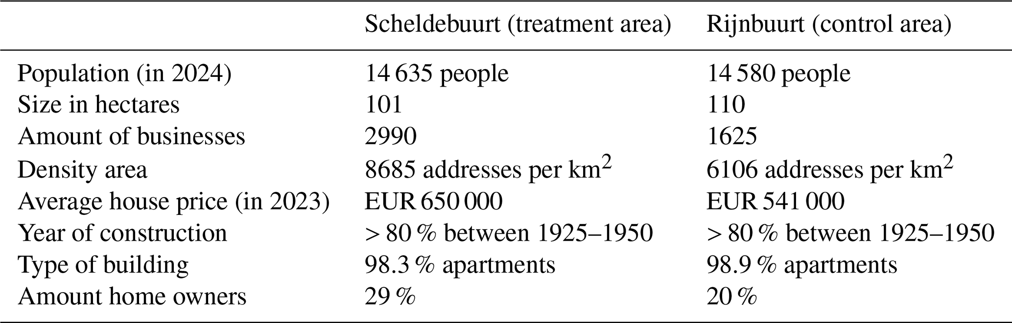Amsterdam Weerproof executed projects in various neighbourhoods. We compare two adjacent areas of the neighbourhood Rivierenbuurt with different postal codes (PC). In PC 1078, Scheldebuurt (treatment area), municipal adaptation measures were executed from 2018 until 2022. We compare this neighborhood to PC 1079, Rijnbuurt (control area), where no measures were taken. Detailed descriptions of the Rivierenbuurt neighbourhood are found in Appendix A. Table 1 describes the climate adaptation measures that were taken in the Scheldebuurt.