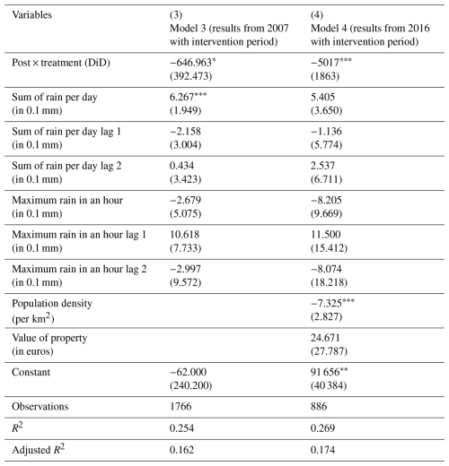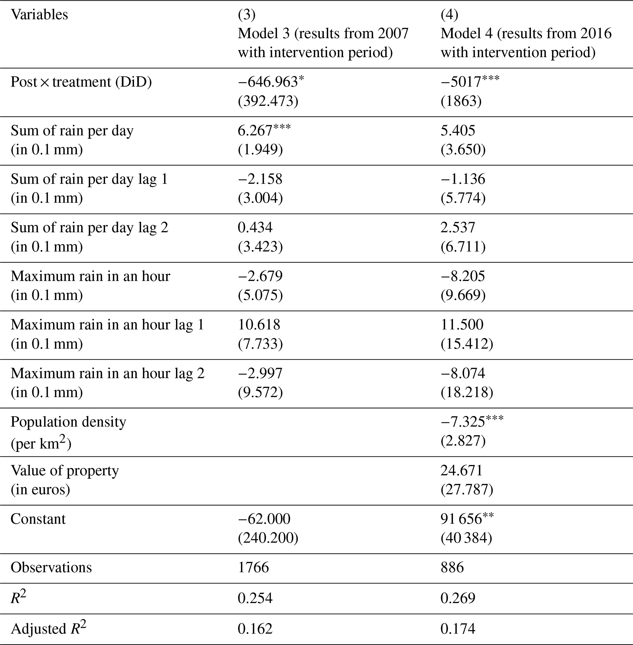 Table 4Two-way fixed effects DiD regression on insured damage per day in case of maximum rain per hour exceeds 2 mm h−1 from 2007 and 2016 without observations in the intervention period.