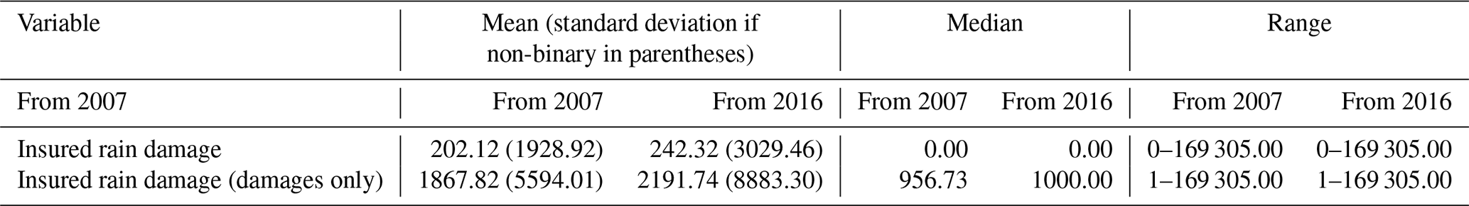 Table E2Detailed description insured rain damage data full dataset (from 2007). Values in euro.