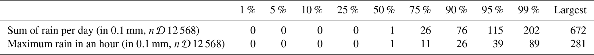 Additionally, data on socio-demographic characteristics of the Rivierenbuurt (e.g. average house price and average size of households) is used to control for neighborhood specific effects. This data is derived from public data of Statistics Netherlands (CBS), which is only available on a yearly basis from 1 January 2016 until 31 December 2023. Therefore, we interpolate between the years to create daily neighborhood characteristic data and extrapolate in the period 1 January 2024 until 15 March 2024 by assuming linear trends. In Appendix E we show tables on the distribution of insured rain damage, a detailed description of insured rain damage data and the distribution of rain data.