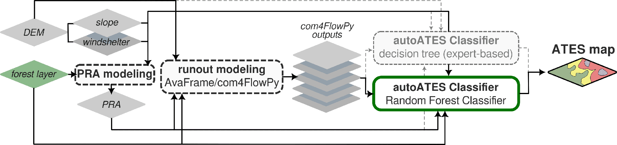 The final step in the AutoATES model chain – the AutoATES classifier – combines layers derived from preceding stages of the model chain (PRAs, runout and intensity outputs, slope, and forest information) into ordinal ATES ratings. Although the specific configuration of input layers employed by the AutoATES classifier varies slightly across different versions of AutoATES (Larsen et al., 2020; Schumacher et al., 2022; Toft et al., 2024) and its local applications (von Avis et al., 2023; Huber et al., 2023; Panayotov et al., 2024b), the underlying classification methodology has remained largely consistent since the release of AutoATES v1.0 (Larsen et al., 2020).