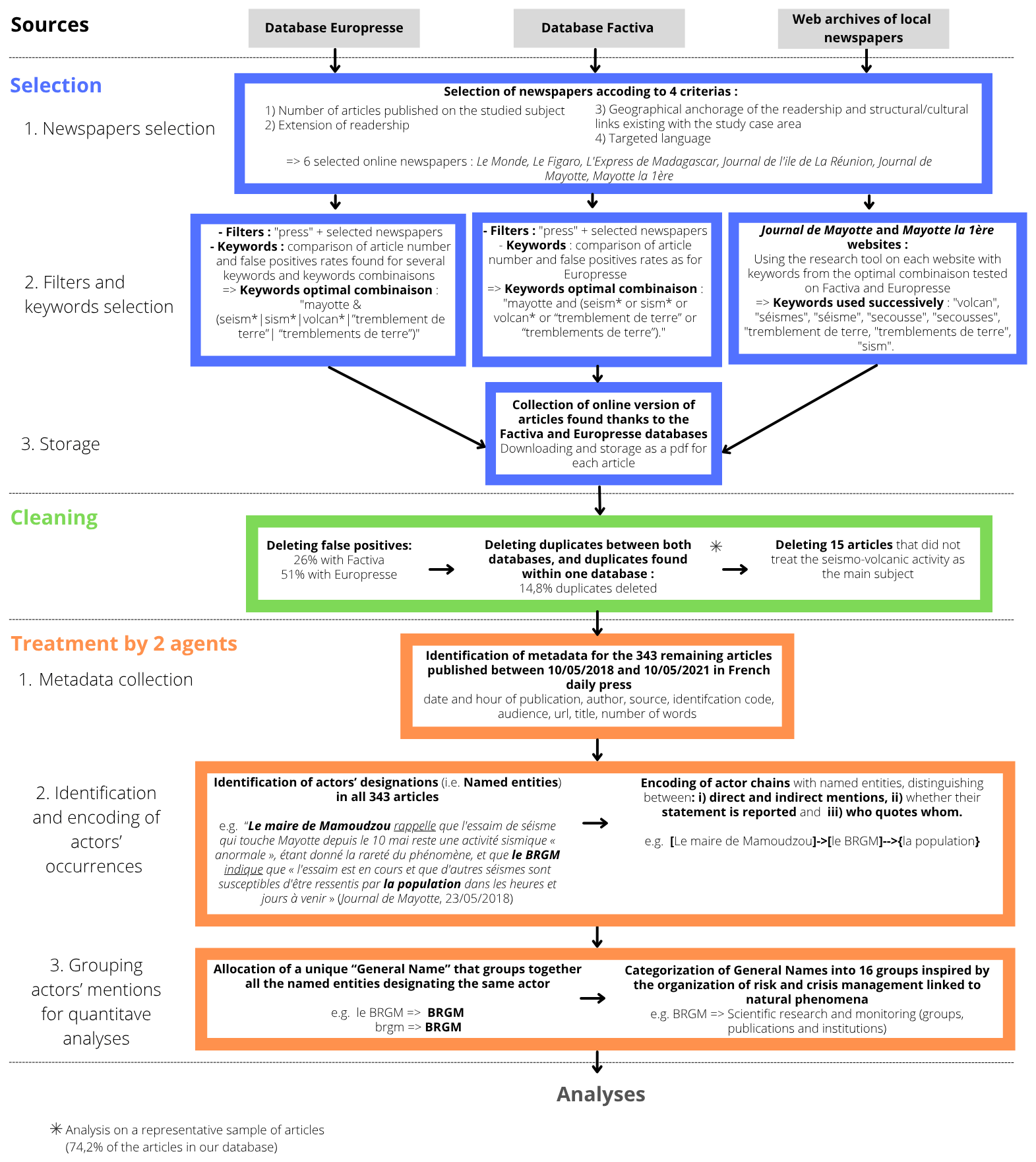 The same selection of articles as in Devès et al. (2022b) and Devès et al. (2023) is used. This selection contains articles from six French-language daily newspapers published between 10 May 2018 and 10 May 2021. The methodology for creating this selection is inspired by Le Texier et al. (2016) and Devès et al. (2019). Newspapers were selected based on four criteria: (1) the number of articles published regarding this case study, (2) the breadth of readership, (3) the spatial distribution of the readership along with the structural and cultural links existing between the region and the study area, and (4) a specific language (French in this study). Six French-language daily newspapers were selected among 56 sources mentioning these events, addressing national (Le Monde, Le Figaro), regional (L'Express de Madagascar, Journal de l'île de La Réunion), and local readerships (Journal de Mayotte and Mayotte la 1ère); see Fig. 2 and Sect. S1 in the Supplement. Articles were then collected from two types of sources: (1) Factiva and Europresse, two full-text press databases offering a selection of general, specialised, paywalled, or freely accessible newspapers with regional, national, and international readerships, and (2) web archives, especially for local press articles which cannot be found in those two databases. The Factiva and Europresse databases are often used by scholars to study media coverage (Severo et al., 2015; Reboul-Touré, 2021; Bernier et al., 2013).