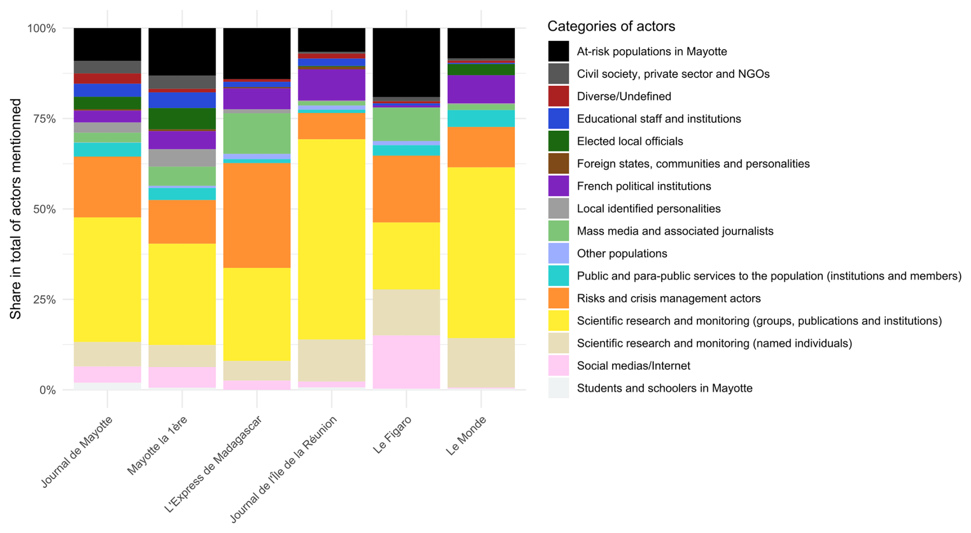 The second-most prominent category of actors is risk and crisis management actors. Here, too, this proportion varies from one outlet to another, with the highest rates observed in the regional daily L'Express de Madagascar and in the national daily Le Figaro. Interestingly, at-risk populations in Mayotte do not exceed a quarter of the total share of actors mentioned in the media. In some newspapers, such as the local daily Journal de Mayotte, the regional daily Journal de l'Île de la Réunion, or Le Monde, they do not exceed 1/10. The relative presence of other actors is more variable from one outlet to another; for example, citations of social networks are more common in Le Figaro than in other newspapers, and a lower frequency of actors from French political institutions is observed in local newspapers than in national and regional newspapers (with the clear exception of Le Figaro).