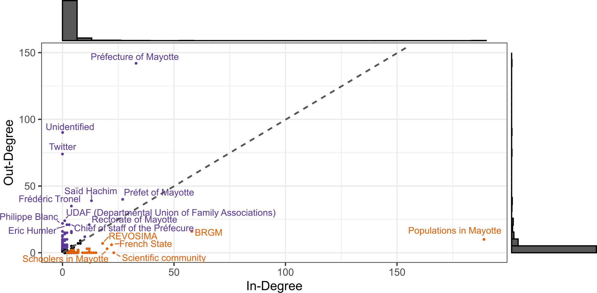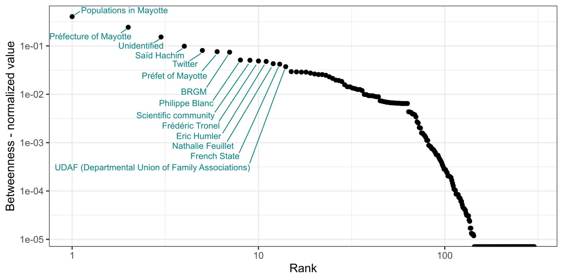 Figure 5 shows an exponential relationship between the normalised values of the betweenness indices and the ranks, indicating a hierarchical structure of the network through the concentration of citation interactions by a small proportion of actors. The Mahoran population emerges as a key connecting element of the network of actors constructed from citation links in the media, a role also prominently filled by the local expert Saïd Hachim. The central role of the prefect and the prefecture, representing the French State in the department, is also evident. The scientific community as a whole, the French geological survey (BRGM), and REVOSIMA also appear to be essential elements in structuring the network, as is the social media platform X (formerly Twitter), which allows media visibility for individuals and institutions and promotes citation chains via re-tweets and mentions. Individuals with many connections also have high degrees of betweenness: Philippe Blanc, Eric Humler, and Frédéric Tronel (mentioned above), as well as Nathalie Feuillet, an observatory physicist at the Institut de Physique du Globe de Paris (IPGP) and mission leader of the first oceanographic campaigns (MayObs 1 and 2; see Feuillet, 2019, and Jorry, 2019), who, despite having lower in-degree and out-degree values, connects a relatively large number of the shortest paths in the network.