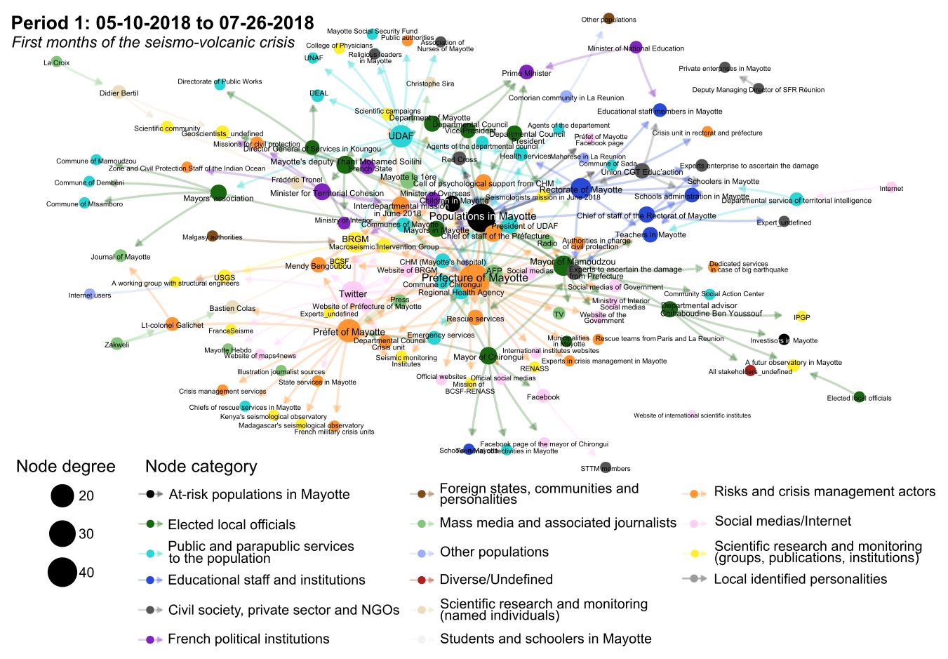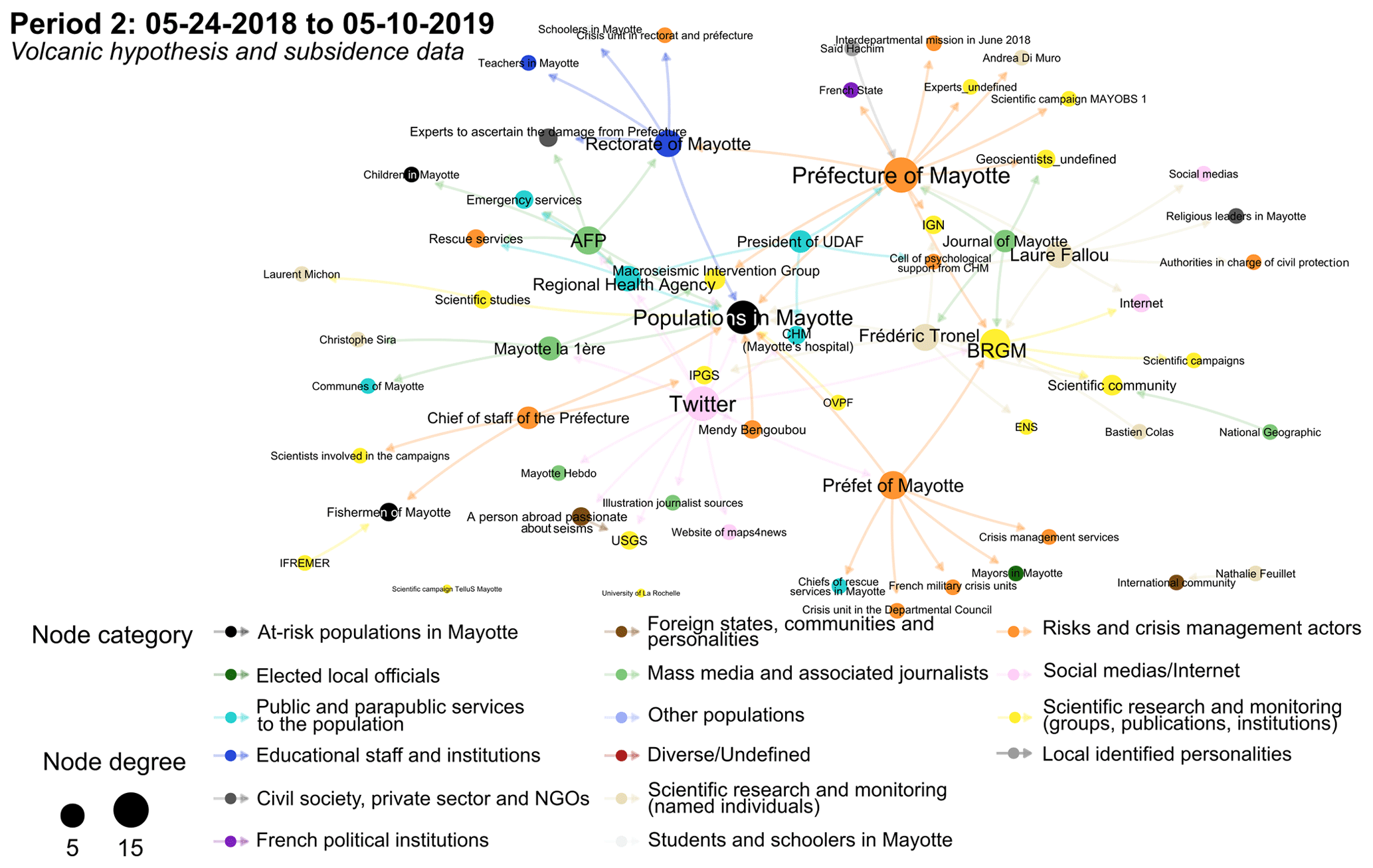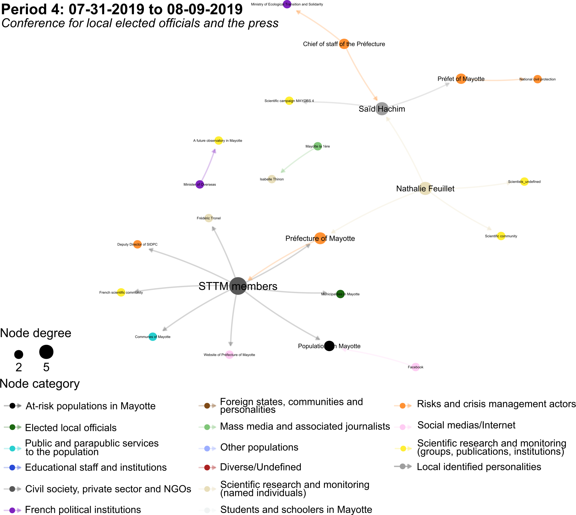 In contrast, Nathalie Feuillet (an observatory physicist), the University of La Rochelle in mainland France, and the Tellus Mayotte oceanographic mission from IPGP are isolated. Christophe Sira, a macroseismic surveyor and member of the Groupe d'Intervention Macrosismique, and Laurent Michon, a research professor at the University of La Réunion, are also separated from other scientific actors. Likewise, Bastien Colas and Mendy Bengoubou, two of the three members of the delegation of specialists in civil security and natural risks dispatched by two ministries (Ministry of Ecology and Ministry of the Interior) to assess the seismo-volcanic activity on site in June 2018, are cited separately from each other and from the interdepartmental mission itself, while the third expert, Lieutenant Colonel Olivier Galichet, is not mentioned in the selected articles. Once again, actors in the medico-social world, who initiate citations of various actors, have intermediate positions in the network, while actors in the educational world are more isolated than during the previous period. Another important distinction is the introduction of a first identified local personality, Saïd Hachim, in the network. In this subset of articles, he only cites the prefecture, as he relayed and detailed a note from the institution mentioning the volcanic origin hypothesis derived from the latest GPS data. Local fishers also appear in the network of actors via citations from IFREMER and the prefect's chief of staff, following the discovery of deep-sea dead fish about 50 km east of the coast.