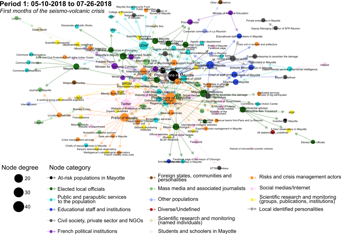 The citation network for the second period, derived from 29 articles published between 5 October 2018 and February 2019, is shown in Fig. 7. These articles focused on the emergence of the volcanic hypothesis and the first subsidence data. As in the first period of the crisis, the population (cited by numerous actors but never initiating a citation) is at the centre of the network. The prefecture and the prefect (and to a lesser extent, the prefect's chief of staff) still emerge as central nodes, initiating numerous citations. Only the prefecture, as an institution, receives a significant number of citations in return (19 citations, 10 for the prefect) from various actor categories. Once again, the institution is separated from its two key figures (prefect and chief of staff) within the citation network, with the exception of common citations of the population and the BRGM. The BRGM is also the destination of numerous citations (24) from scientific actors, which allows it to partially aggregate them within the network. Two scientific personalities stand out for the number and diversity of co-citation links they create: Laure Fallou and Frédéric Tronel. The first is a sociologist at the Euro-Mediterranean Seismological Centre (EMSC) who wrote an academic paper highlighting the emergence of a mistrustful atmosphere and the circulation of misinformation due to a lack of scientific information linked to the scarcity of seismic data. Although Fallou et al. (2020) was published in 2020, it was also the subject of public communication at the General Assembly of the European Geosciences Union in April 2019. The second was the regional director of BRGM in Mayotte between 2017 and 2020.