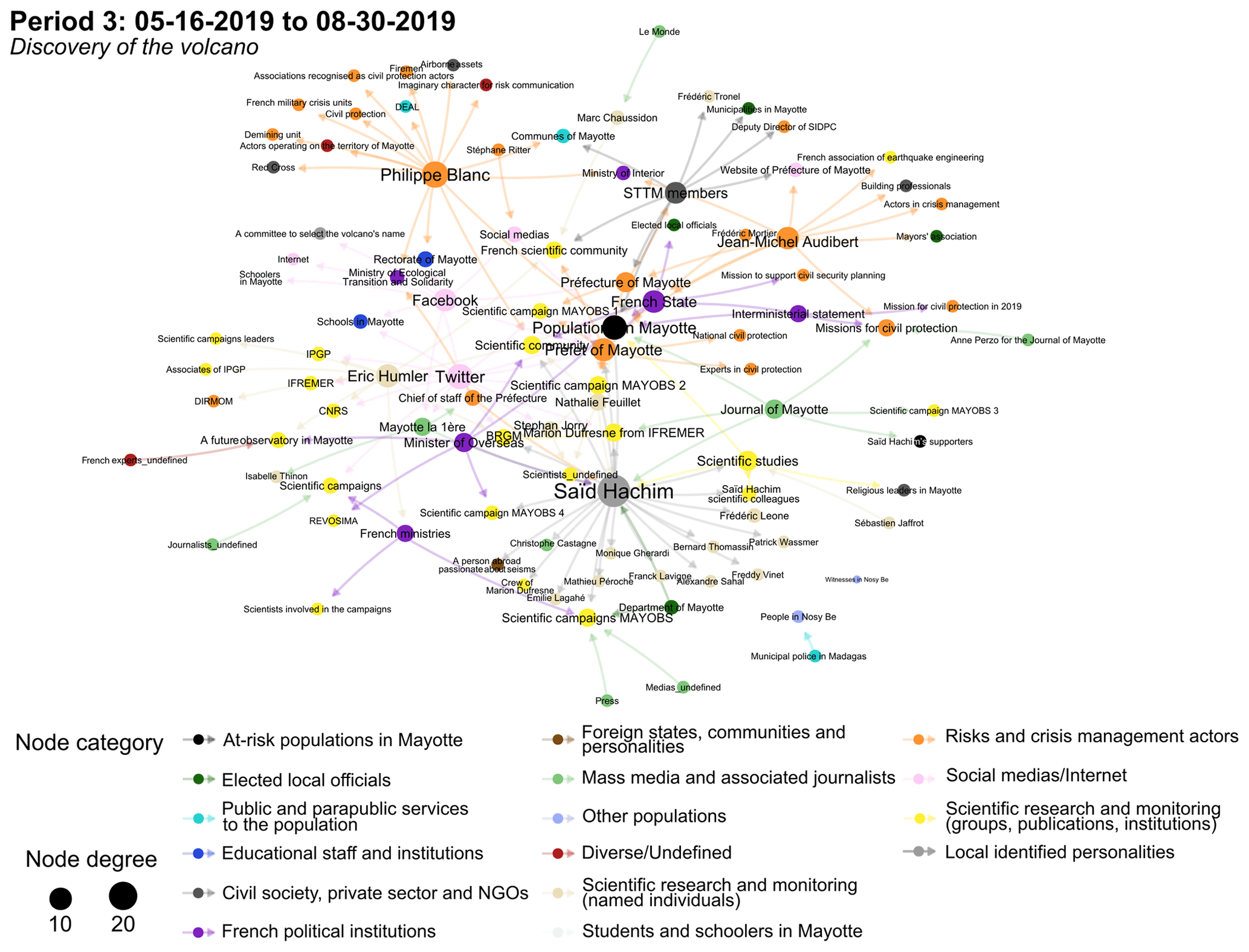 The third period studied corresponds to the discovery of the underwater volcano and covers 36 articles published from 16 May 2019 to 30 August 2019. Figure 8 depicts its actor co-citation network. Compared to the previous periods, the central connecting role of the population is diminishing, while the position of local actors acting either as relays for residents' voices (such as the Facebook group Signalement Tremblement de Terre Mayotte, or S.T.T.M.) or as relays for scientific voices (such as Saïd Hachim) is strengthened. Philippe Blanc, as a member of a civil security mission on volcano-related risks, also appears as an important source of citations in the network, mainly for other risk and crisis management actors, without receiving any citations in return. The same is true for Jean-Michel Audibert, who was part of the same mission for civil security; the two actors are only connected by their shared citation of the Mahoran population.