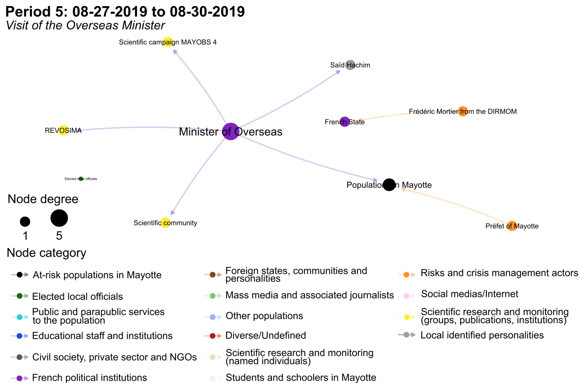 Period 5 (Fig. 10) focuses on a second specific event within Period 3: the visit of the minister for Overseas France to Mayotte. This period covers three articles published between 27 August 2019 and 30 August 2019. As depicted in Fig. 10, the number of cited actors is low. The minister for Overseas France occupies a central place in the network, as they mention five other actors: the scientific actors responsible for studying the phenomenon (REVOSIMA and the underwater observation campaign MayObs 4), the scientific community more generally, the local expert Saïd Hachim, and the Mahoran population (also cited by the prefect). The isolated mention of the French State by Frédéric Mortier (from the interministerial delegation for major overseas risks, DIRMOM) and a separate mention of local elected officials can also be noted.