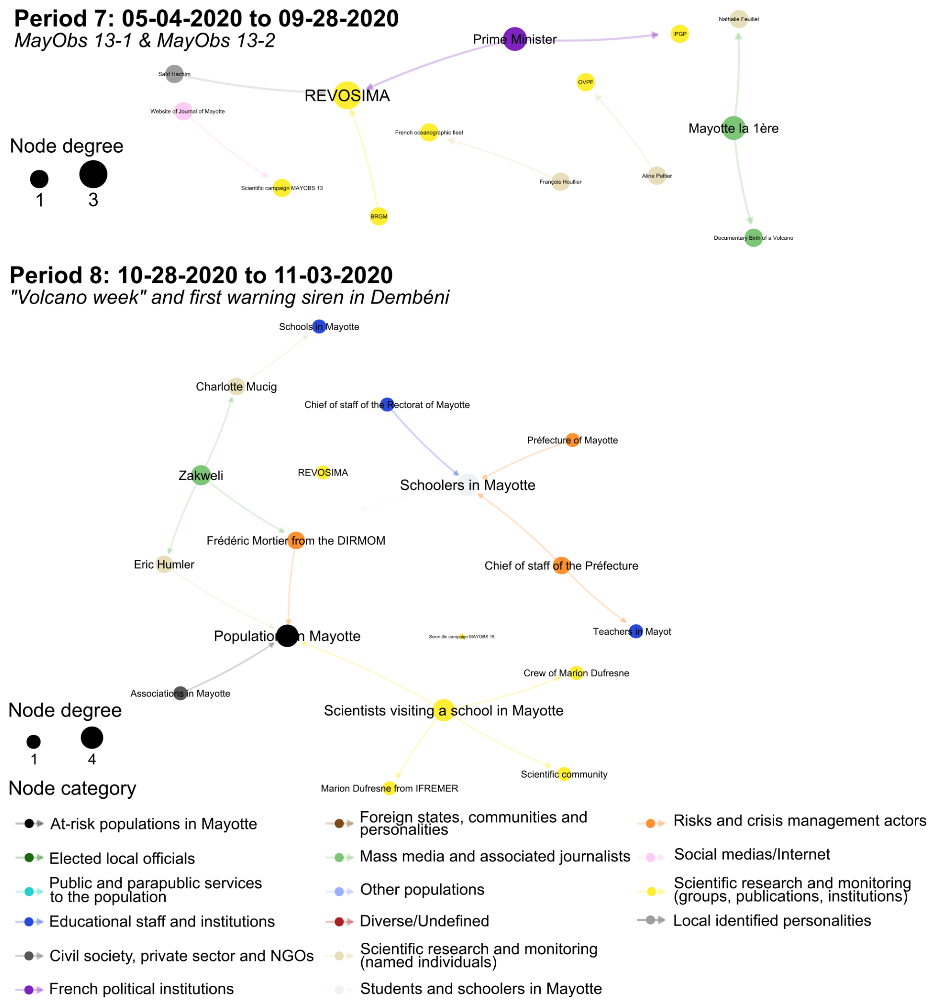 Figure 12Actor citation networks during two key periods. In Period 7, the focus is on the organisation and execution of two campaigns at sea, MayObs 13-1 and MayObs 13-2. In Period 8, attention shifted to two communication initiatives from the Mayotte prefecture: the “volcano week” (a series of conferences and activities for schoolers) and the installation of the first public warning siren on the territory.