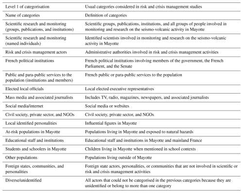 Table 1Denominations and definitions of categories used to group actors identified by two researchers in a database of 343 daily press articles published between 10 May 2018 and 10 May 2021 covering the first 3 years of the recent seismo-volcanic unrest in the Mayotte archipelago. Categories are determined according to the organisation of risk and crisis management in France (see Fearnley and Beaven, 2018, and Sect. S2.2 in the Supplement).