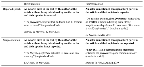 Reported speech and simple mentions of actors are also distinguished (see Table 2). Reported speech can be direct or indirect. Reported speech is defined as any text that the journalist presents as the words or opinions of an actor, whether it appears to be reported directly (e.g. with the use of quotation marks), indirectly, or even in a distorted manner. For example, in the sentence, “In May 2018, when the swarm of earthquakes began to shake Mayotte, the first scientists rushing to the island did not believe in volcanic activity”, the phrase “did not believe in volcanic activity” is considered to be reported speech since the news item is intended to convey their beliefs. In contrast, in the sentence, “End of mission: French prefect Dominique Sorain leaves Mayotte”, Dominique Sorain is “simply mentioned”.